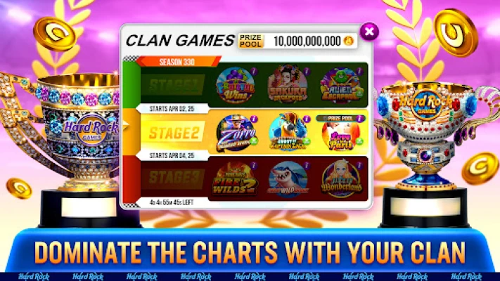 • Play any slot game to earn Clan Points, contribute more by spinning slots at higher levels, and rise through seasonal slot machine leaderboards for the chance to earn crowns, coins, and in-game honors.
