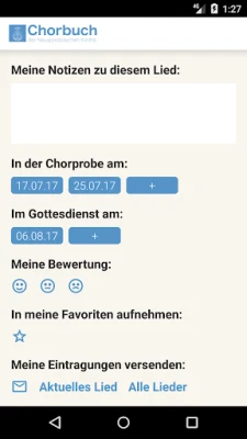 - Termine von Chorproben & Gottesdiensten eintragen, in denen das Lied gesungen wurde (oder werden soll)