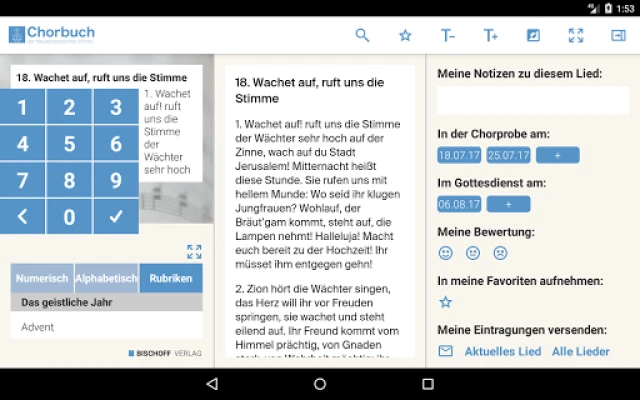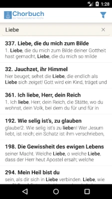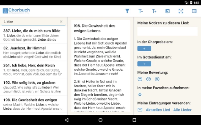 Die Chorbuch-App bietet allen Musikinteressierten, Dirigenten und Dienstleitern die Möglichkeit, die Texte aus dem Chorbuch schnell und einfach nachzuschlagen.
