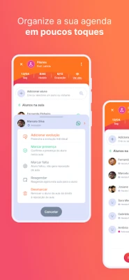 • Inclua todos seus alunos no app, para agilizar você pode incluí-los importando os contatos do seu celular. Depois é só identificar o plano dele e fazer os agendamentos. Não tem erro, é só seguir o passo a passo.