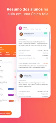 • Na hora da aula você pode: ver o resumo da aula com as informações dos alunos presentes; dar presença, falta ou gerar reposição; e adicionar a evolução do aluno. Assim tudo ficará digital e sempre com você.