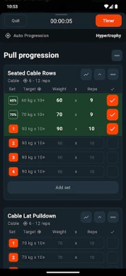 Be challenged daily with automatically adjusted target reps, weight, and duration based on your previous workouts and feedback. Tailored to your training style and goals (hypertrophy, strength, or endurance), the progression is also highly customizable to suit your needs.